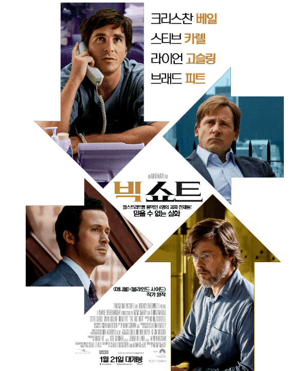 2008년 글로벌 금융위기를 다루고 있다. 주택저당증권 (MBS) 서브프라임 대출상품의 무분별한 발행으로 부실이 생겨 일어난 사건으로 돈의 붕괴를 예측하고 빅쇼트 공매도를 하여 엄청난 수익을 번 4명의 천재들의 이야기이다. 크리스찬 베일이 2022년 하락장세에도 계속 언급되고 있는 마이클 버리 역을 맡았고 스티브 카렐은 펀드매니저 마크 바움 역을 라이언 고슬링은 트레이더 자레드 베셋역을 마지막으로 브래드피트가 전직 트레이더 벤 리커트역을 맡게 된다. 영화에서 마이클 버리는 주택시장의 붕괴를 데이터들을 확인하여 확신하고 거대한 공매도 배팅을 하게 된다. 모기지 채권( 주택담보대출) 서브프라임이 문제라는 것에 확신한 그는 그 현상이 일어나기 전까지 많은 고뇌의 밤을 보내게 된다. 의심이 많고 도덕심이 강한 마크 바움은 먼저 주택시장붕괴를 파악하고 하락배팅 상품을 판매하려고 하는 자레드와의 만남에서 모기지채권에 대한 의심이 증폭되고 결국 주택시장에 거품이 있나 직접 확인하러 다닌다. 마크 바움은 실제 실태조사를 해가며 실제 상황은 더욱더 최악이라는 걸 파악하게 되고 그렇게 마크는 자레드의 상품을 사게 된다. 그리고 우연히 은행에 찾아왔던 찰리와 제이미는 자레드의 투자설명서를 보고 신용부도스와프(CDO)에 투자해야 한다고 판단 벤에게 자료를 보내 도움을 요청하고 벤의 도움으로 공매도를 할 수 있게 된다. 하지만 사람들의 거짓과 입장 이기심으로 그들의 생각대로 하락은 쉽게 오지 않았다. 그렇게 고통의 시간이 지난 후 결국 그들의 생각대로 모기지가 붕괴되고 그렇게 그들은 돈을 벌지만 결과는 씁쓸함을 남긴다.